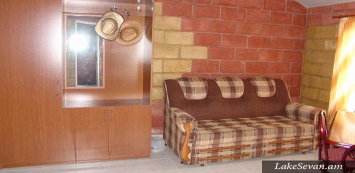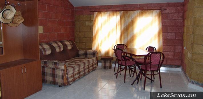 4 անձի համար քոթեջ - 1 ննջարան (երկտեղանոց մահճակալ), հյուրասենյակ (բացվող բազմոց), սառնարան, սեղան, սանհանգույց, լոգարան։